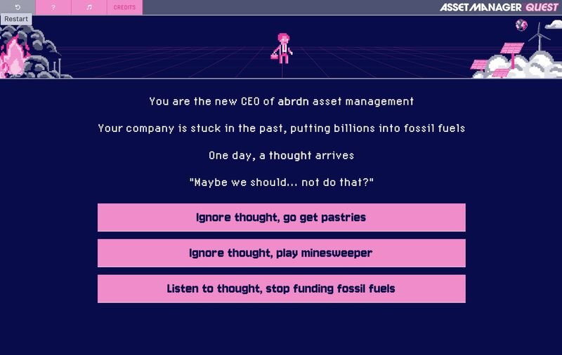 A simple quest game where players take the role of Abrdn’s chief executive and take decisions with serious consequences on a sustainable (or not) future, highlighting how the firm is ‘toying with our future’